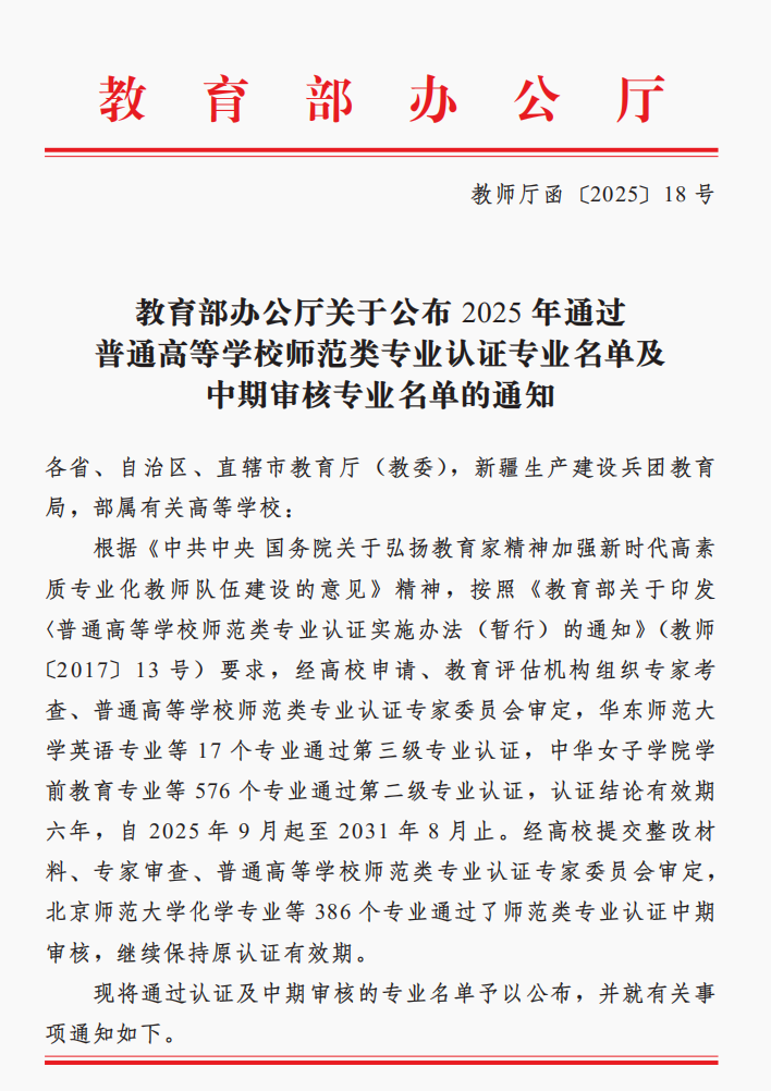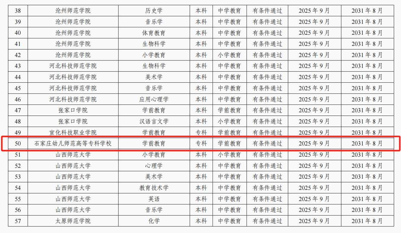 近日,教育部办公厅正式发布《关于公布2025年通过普通高等学校师范类专业认证名单及中期审核专业名单的通知》(教师厅函〔2025〕18号),我校学前教育专业顺利通过教育部普通高等学校师范类专业第二级认证,认证结论有效期六年(2025年9月起至2031年8月止),成为河北省首批通过师范类专业国家级认证的专科专业,此次认证成果的取得,标志着我校学前教育专业的人才培养质量得到了国家权威机构的认可,成为专业建设历程中的一个重要里程碑。